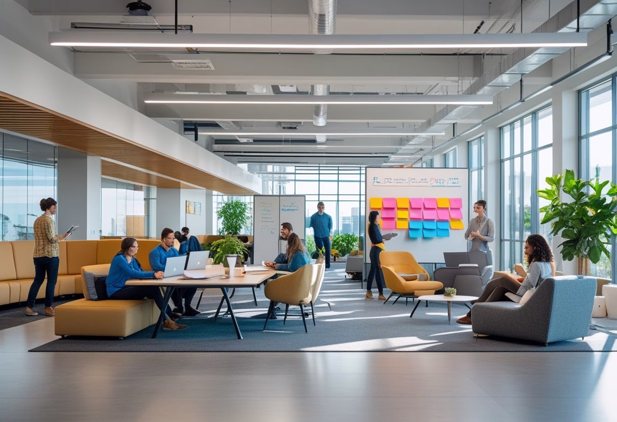 A modern office with diverse professionals working in different areas, including collaboration, focused individual work, and team brainstorming.