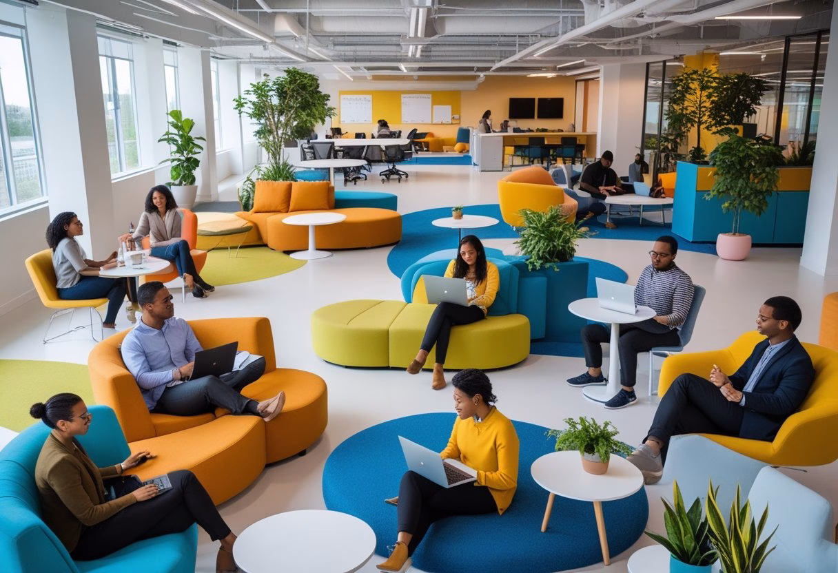In an activity-based workplace, employees select spaces that support focus, teamwork, or informal talks.