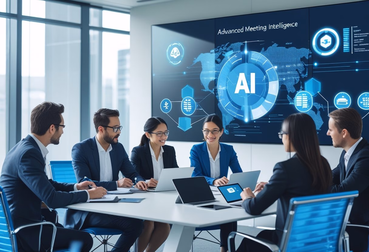 A group of business professionals collaborating around a conference table with digital devices and holographic data displays representing AI meeting tools.