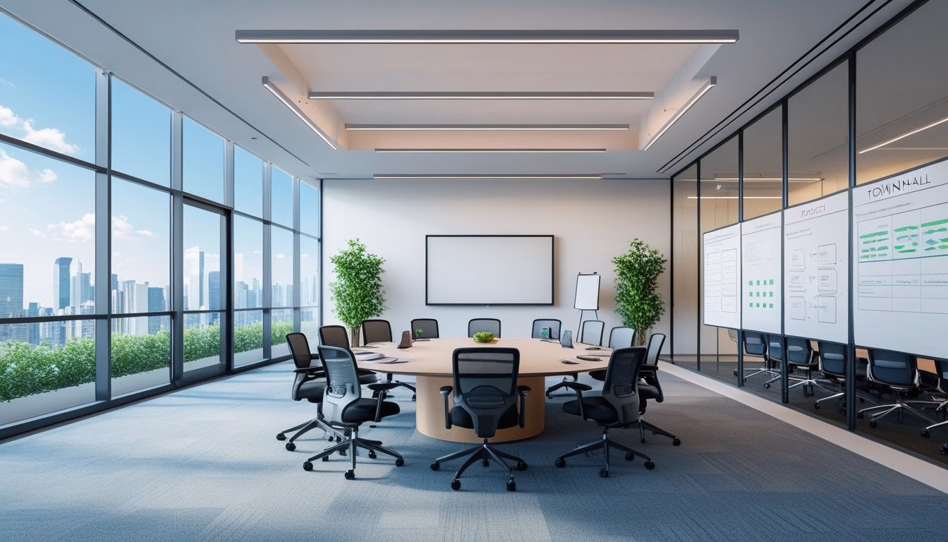 Townhall adalah ruang besar atau auditorium untuk 50+ orang. Fungsi utamanya komunikasi perusahaan, presentasi, dan Q&A. Teknologi yang diperlukan: sistem AV profesional, mik untuk pembicara, dan streaming untuk remote employees.