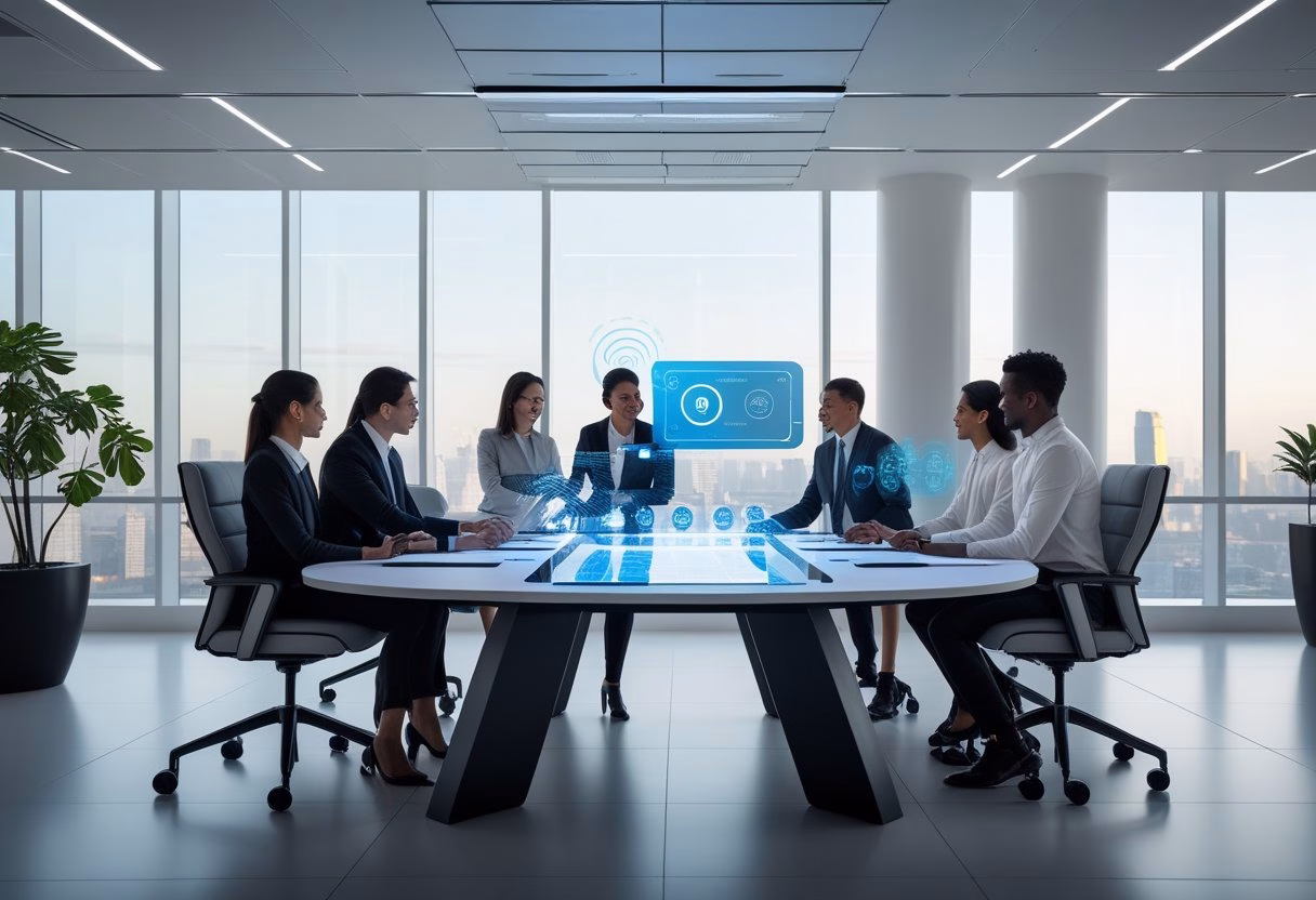 A modern office with professionals collaborating around a table using advanced technology in a bright, spacious workspace.