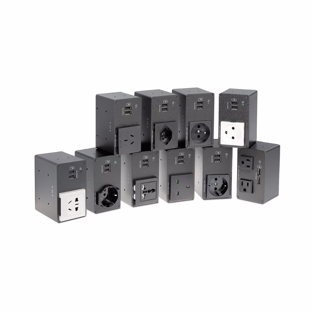 Extron AC+USB 200 Series Power Modules for Cable Cubby® Series and select TouchLink® enclosures are available with discrete AC power outlets for the US, Europe, and other major world markets. They feature one or two unswitched AC power outlets, and two USB Type-A power outlets. The AC+USB 244 US provides +5 VDC up to 4 A / 20 watts of USB power; while the non-US modules provide +5 VDC up to 3.0 A / 15 watts of USB power for charging mobile devices such as laptops, smartphones, and tablets. AC+USB 244 US cord and conduit US power modules are UL/c-UL listed. Extron AC 100 Series Power Modules and AC+USB 300 Series Power Modules are available for applications where AC or AC with USB Type-A and USB Type-C® power outlets are needed.