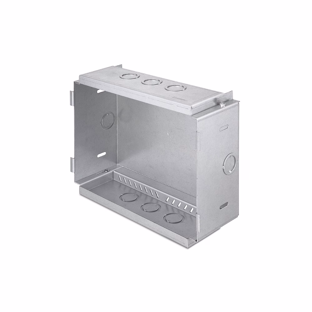 The BB 710M back box is designed to provide a recess-mounted steel enclosure for the Extron TLP 710MV, TLP Pro 720M, and TLP Pro 1022M. It allows these touchpanels to be mounted in retrofit or pre-construction applications where an in-wall installation is required. The BB 710M provides standard knockouts for fixed or flexible conduit.