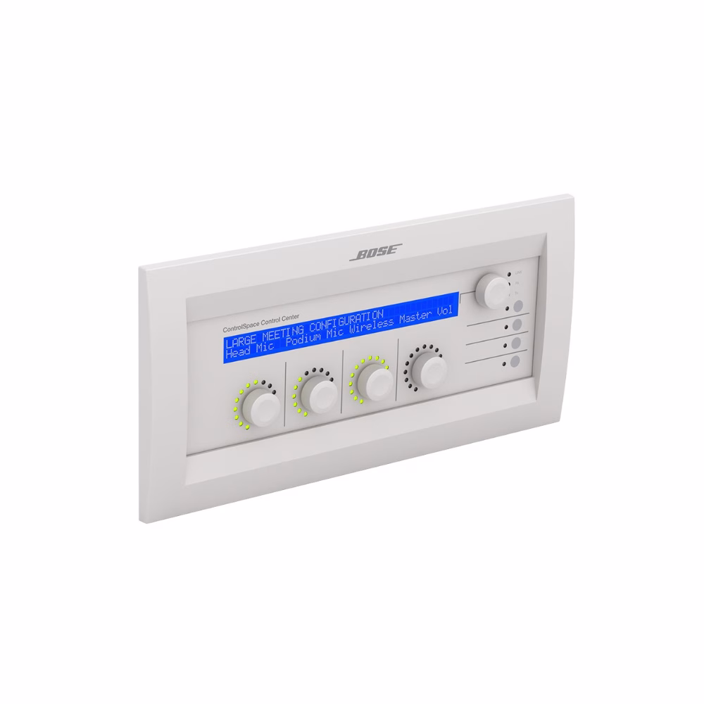 The Bose Professional ControlSpace CC-64 control center is an elegant, programmable, networked controller that provides users a simple and logical interface to their sound systems when using ControlSpace ESP processors and/or network version PowerMatch amplifiers. Because the controller is completely programmable, you can customize the sound system, making only certain controls available, and simplifying user interaction with the system. The CC-64 provides four rotary encoders with circular LED rings for a user-friendly method of managing gain settings or scene selections. A fifth encoder (upper right) provides control over programmed “scenes” or presets. Four bank switch buttons redefine the four Gain/Selector control knobs, providing quick access for up to 16 system gain controls or selectors. A large, two-line-by-40-character backlit LCD provides users the names of the system elements they are controlling.