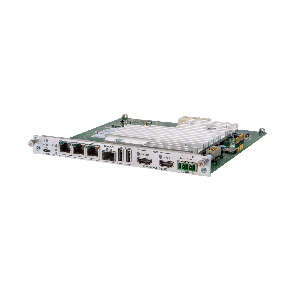 The DM-NVX-360C is an AV-over-IP encoder/decoder card that occupies one card slot in a DMF-CI-8 card chassis. The card is designed to function as either a transmitter or receiver in a high-density rack-mount installation. Capable of handling a network AV installation of any size, the DM‑NVX‑360C includes features such as secure web-based control and management, a scaling HDMI® output, video wall processing, an analog audio input or output, native AES67 transmit and receive capability, USB 2.0 and KVM integration, and support for copper and fiber Ethernet connectivity.2, 3