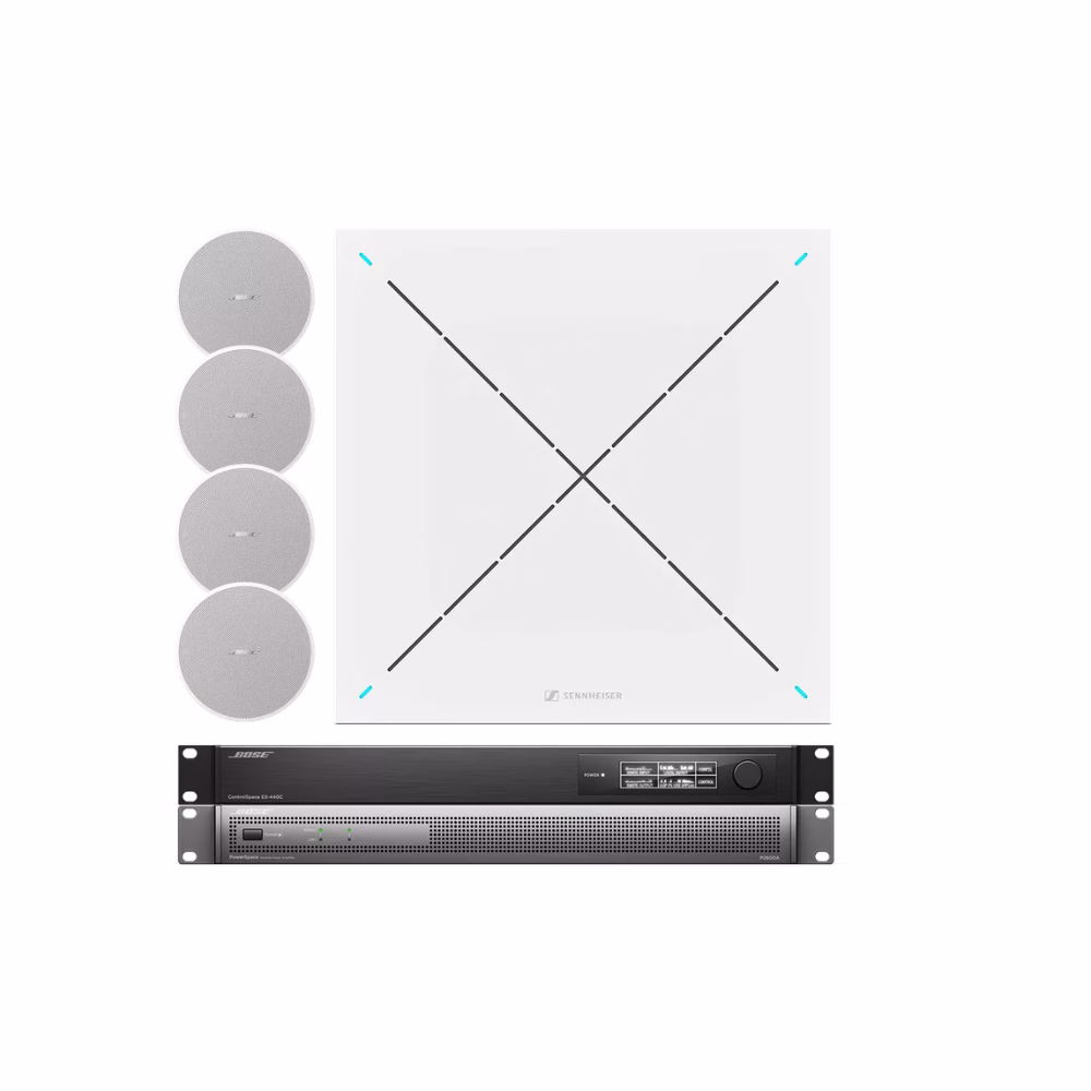 Bose Professional Ceiling Audio Solutions are complete conferencing systems for fully integrated meeting rooms. They combine the premium performance of Bose Professional loudspeakers and a Sennheiser TeamConnect Ceiling 2 microphone — along with a Bose Professional amplifier and DSP — to deliver a seamless meeting experience that empowers productivity. They’re complete room audio solutions, ready for quick deployment and configuration of the electronics, reducing installation time. A Bose Professional Ceiling Audio Solution is more than fully integrated — it’s truly integrated. Completely out of the way. With fewer devices on walls and tabletops, meeting participants can stand, sit, or move around the room freely with the confidence that they’ll hear and be heard.
