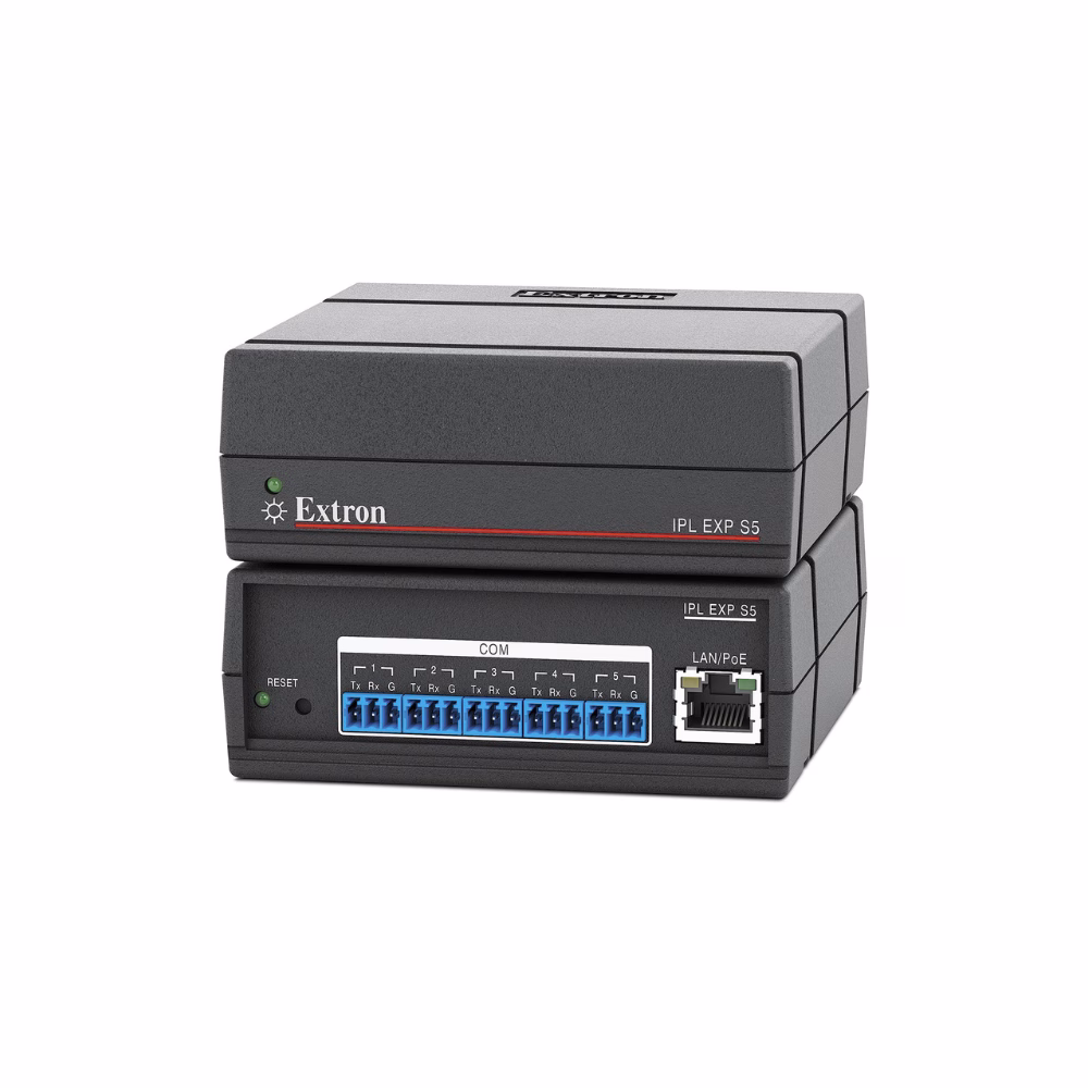 The Extron IPL EXP S5 is a Control System I/O Expansion Interface designed for easy control system expansion with five additional RS-232 ports. It works in combination with our IPCP Pro xi Series Pro Series control processors, which are securely configured with Global Configurator Professional or programmed with Extron ControlScript programming. This interface, as well as all Extron I/O Series Expansion Interfaces features the convenience of PoE and can be controlled, monitored, and accessed over your network. The IPL EXP S5 is a compact expansion solution housed in a durable 1U quarter rack enclosure and offers a broad variety of mounting options.