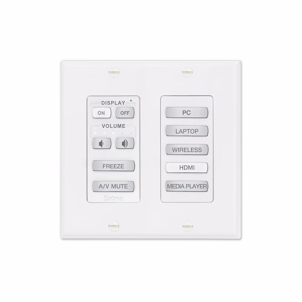 The MLC Plus 84 D is an easy-to-use, two-gang Ethernet controller used for controlling common AV functions such as power, input switching, and volume. As part of the new MediaLink Plus Series, the MLC Plus 84 D is designed with more powerful features and enhanced security. It has eleven backlit soft touch buttons and a variety of ports and inputs, including a remote volume control port for use with select Extron amplifiers. It is Extron’s first pushbutton controller to support Ethernet control of a wide range of AV devices. Power over Ethernet allows the controller to receive power and communication over a single Ethernet cable. The MLC Plus 84 D mounts in a two-gang junction box, and includes a white decorator-style wallplate.