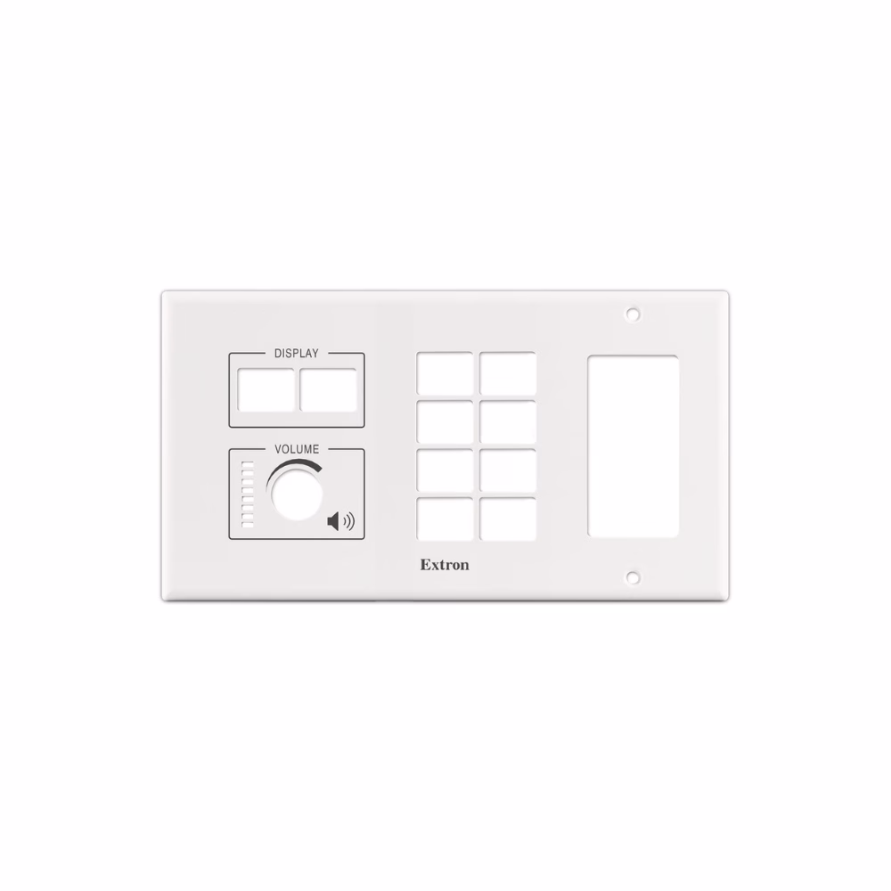 The Extron MLM 200 D is a four-gang wall mounting kit with a decorator-style opening designed for use with the MLC Plus 200 controller, EBP 200 eBUS® Button Panel, and NBP 200 Network Button Panel. The MLM 200 D fits into a wall, Extron SMB Surface Mount Box, or EWB External Wall Box. The kit ships with both black and white faceplates and volume knobs, as well as a mud-ring. The MLC Plus 200, EBP 200, and NBP 200 are sold separately.