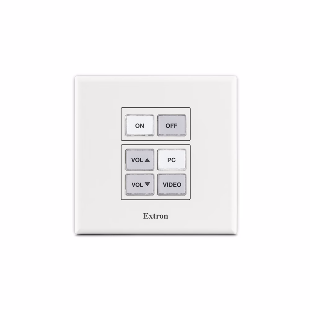 The Extron NBP 50 Network Button Panel is a fully-customizable AV system control interface for Extron Pro Series control systems and HC 400 Series products. Network Button Panels connect to a control processor using standard Ethernet. These customizable, easy-to-use control panels work in conjunction with a control processor to perform a wide variety of AV system functions such as display On/Off, input switching, volume control, and much more. The NBP 50 features six dual-colored backlit buttons for easy operation in low-light environments and the convenience of PoE. The NBP 50 mounts in a two-gang junction box and includes black and white faceplates and mud ring.