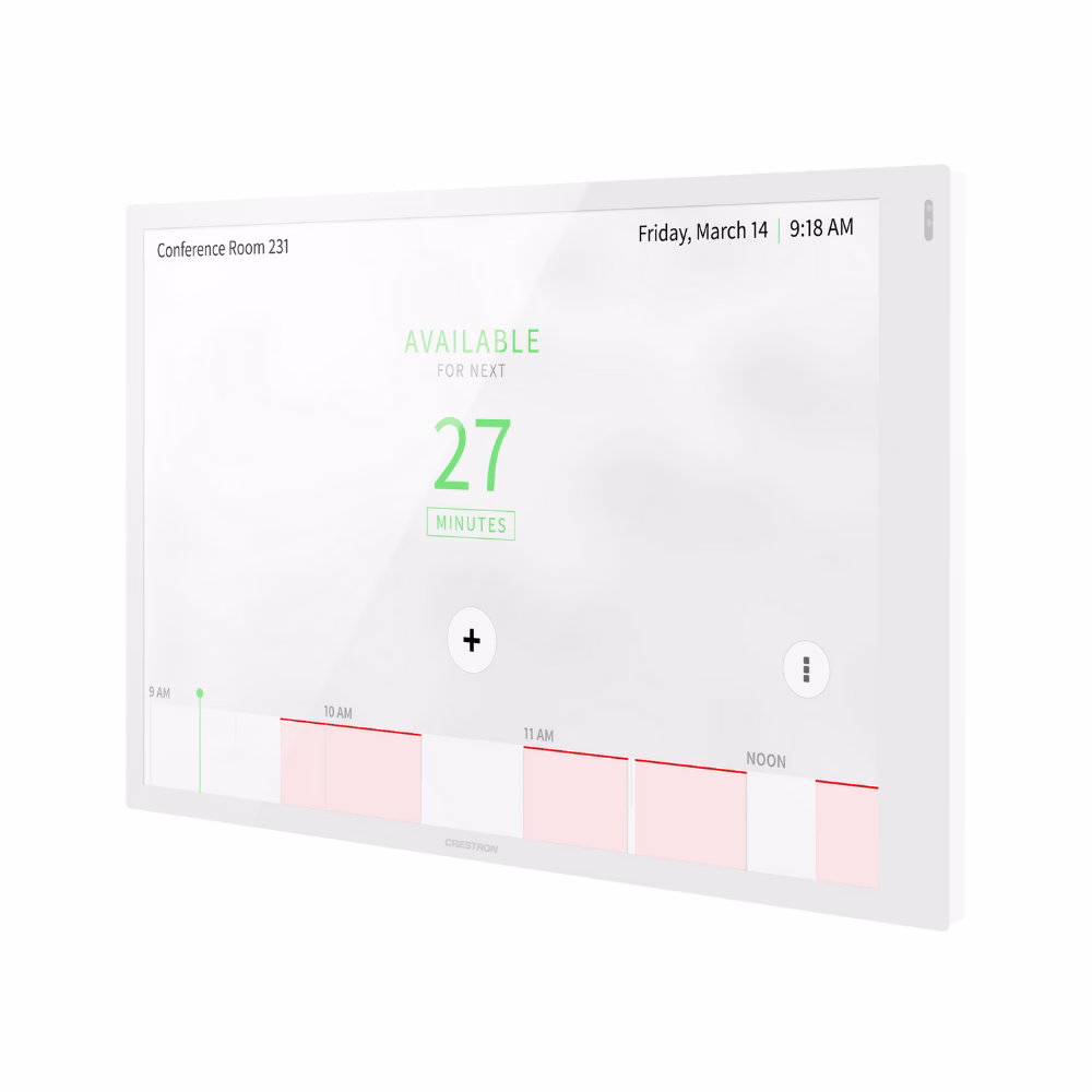 A stylish and versatile wall mount touch screen featuring web browsing, Crestron HTML5 and Smart Graphics® software technology, custom‑programmable icons, H.265/H.264 streaming video, a Rava® SIP intercom, Wi‑Fi network® connectivity, and PoE+ (Power over Ethernet Plus) network power. Built‑in applications are provided for room scheduling, conferencing, and home control.