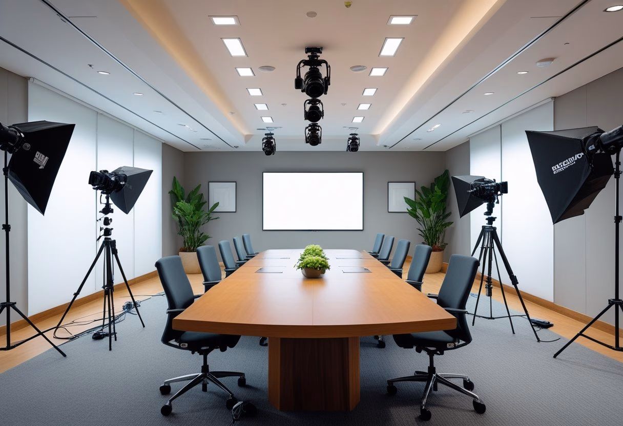 A modern conference room equipped with cameras, studio lights, monitors, and ergonomic chairs arranged around a large table, ready for video production.